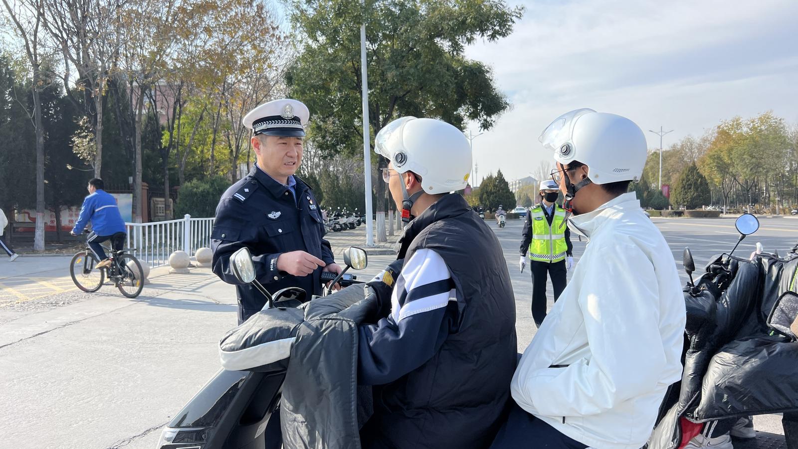 “你俩头盔戴得挺好,但是你俩能同乘一辆车不?”莫海涛拦下同乘一辆电动自行车的2名男生询问,“万一发生交通事故导致他受伤,你可是要给他赔偿呢。”莫海涛指着搭载的男生对骑车男生说,搭车的男生立即从车上下来。
