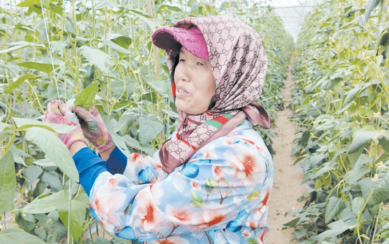 近日,在平罗县陶乐镇庙庙湖村沙漠温室大棚里,红瑞村村民马志梅正在采摘豆角。