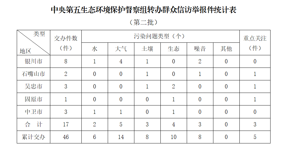 5月31日,中央第五生态环境保护督察组向宁夏回族自治区转办第二批信访举报件共17件(重点关注件3件),其中来电17件、来信0件。本批次信访举报件涉及银川市8件、石嘴山市2件、吴忠市3件、固原市1件、中卫市3件。上述信访举报件已全部及时交办调查处理。
