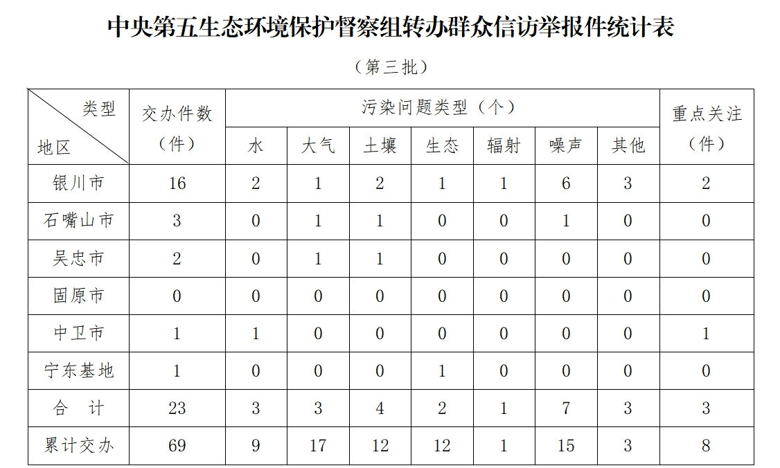 6月1日,中央第五生态环境保护督察组向宁夏回族自治区转办第三批信访举报件共23件(重点关注件3件),其中来电22件、来信1件。本批次信访举报件涉及银川市16件、石嘴山市3件、吴忠市2件、中卫市1件、宁东基地1件。上述信访举报件已全部及时交办调查处理。