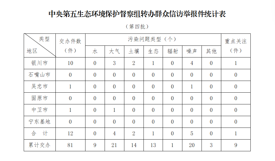6月2日,中央第五生态环境保护督察组向宁夏回族自治区转办第四批信访举报件共12件(重点关注件1件),其中来电12件、来信0件。本批次信访举报件涉及银川市10件、吴忠市1件、中卫市1件。上述信访举报件已全部及时交办调查处理。