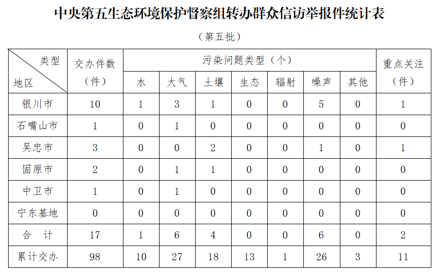 6月3日,中央第五生态环境保护督察组向宁夏回族自治区转办第五批信访举报件共17件(重点关注件2件),其中来电15件、来信2件。本批次信访举报件涉及银川市10件、石嘴山市1件、吴忠市3件、固原市2件、中卫市1件。上述信访举报件已全部及时交办调查处理。