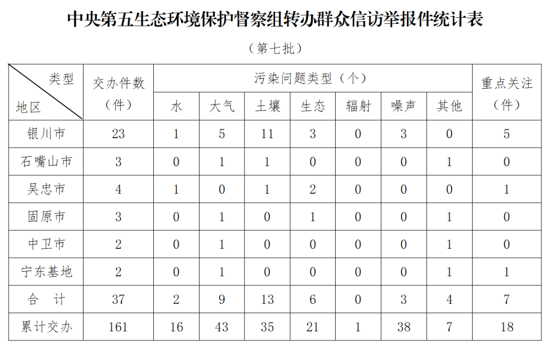 6月5日,中央第五生态环境保护督察组向宁夏回族自治区转办第七批信访举报件共37件(重点关注件7件),其中来电30件、来信7件。本批次信访举报件涉及银川市23件、石嘴山市3件、吴忠市4件、固原市3件、中卫市2件、宁东基地2件。上述信访举报件已全部及时交办调查处理。