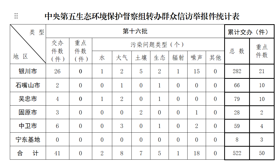 截至6月14日,中央第五生态环境保护督察组累计向宁夏回族自治区转办信访举报件共522件,涉及水污染问题41个、大气污染问题166个、土壤污染问题92个、生态破坏问题59个、辐射污染问题3个、噪声污染问题138个、其他污染问题23个。
