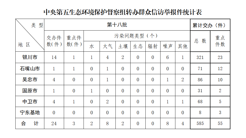截至6月16日,中央第五生态环境保护督察组累计向宁夏回族自治区转办信访举报件共585件,涉及水污染问题45个、大气污染问题183个、土壤污染问题106个、生态破坏问题59个、辐射污染问题3个、噪声污染问题161个、其他污染问题28个。