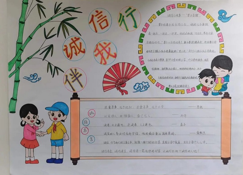 同时,同学们积极绘制诚信主题手抄报。一张张图文并茂、内容鲜活的手抄报作品,生动诠释了学生们对诚信的理解,传递出“内诚于心,外信于人” 的坚定信念。