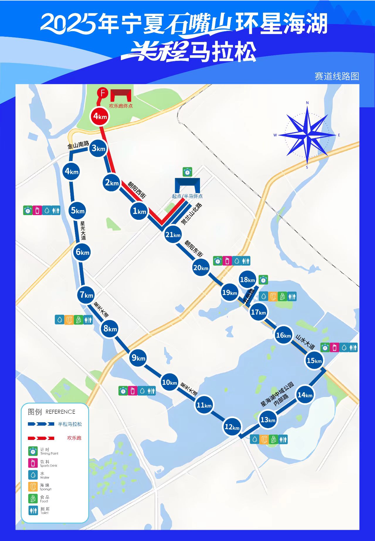 1.半程马拉松路线:和平广场(起点)—贺兰山北路(右转)—朝阳西街(左转)—金山南路(左转)—星光大道(左转)—星海湖中域公园内部路(左转)—山水大道—五岳路(折返)—山水大道—朝阳东街(右转)—和平广场(终点)。