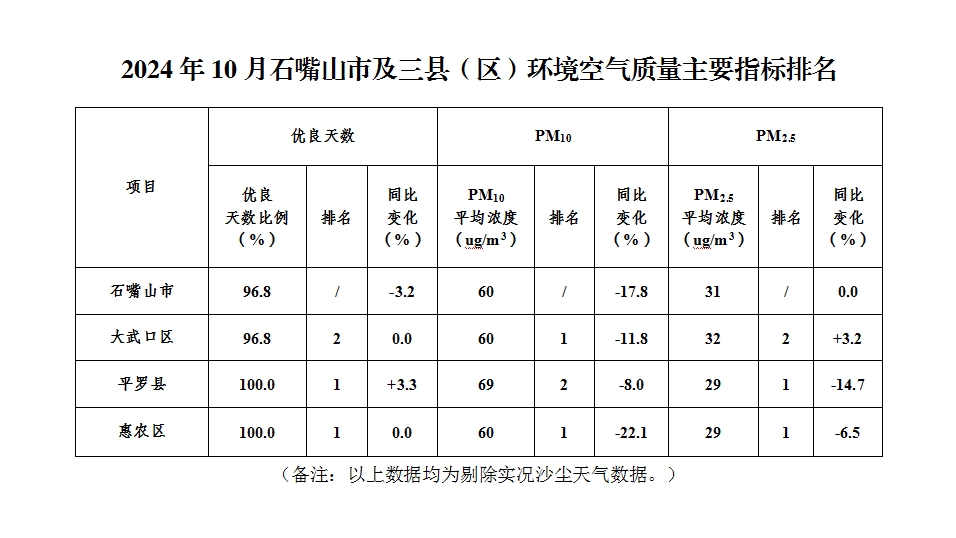 2024年10月石嘴山市及三县(区)环境空气质量主要指标排名