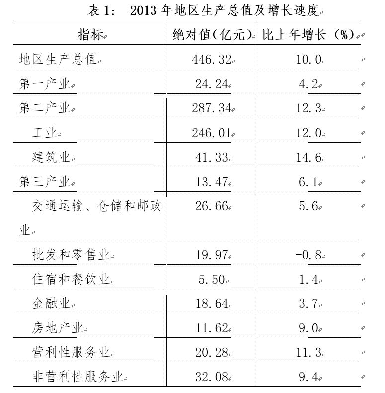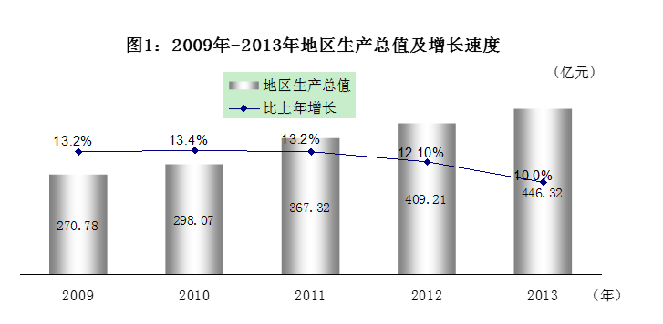 初步核算,全市实现地区生产总值446.32亿元,增长10.0%。其中:第一产业增加值24.24亿元,增长4.2%;第二产业增加值287.34亿元,增长12.3%;第三产业增加值134.74亿元,增长6.1%。三次产业比例为5.4:64.4:30.2,对经济增长的贡献率分别为2.2%、79.9%、17.9%。