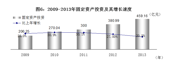 全市完成固定资产投资459.16亿元,比上年增长20.5%。其中:第一产业投资11.6亿元,比上年增长26.0%;第二产业投资235.6亿元,比上年增长18.2%;第三产业投资212亿元,比上年增长22.8%。