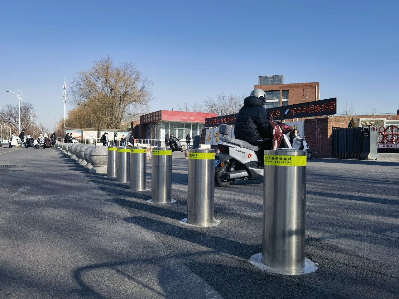 石嘴山市光明中学学生正在有序进入学校,校门前的升降柱和防撞石成为校园安全第一道“屏障”。