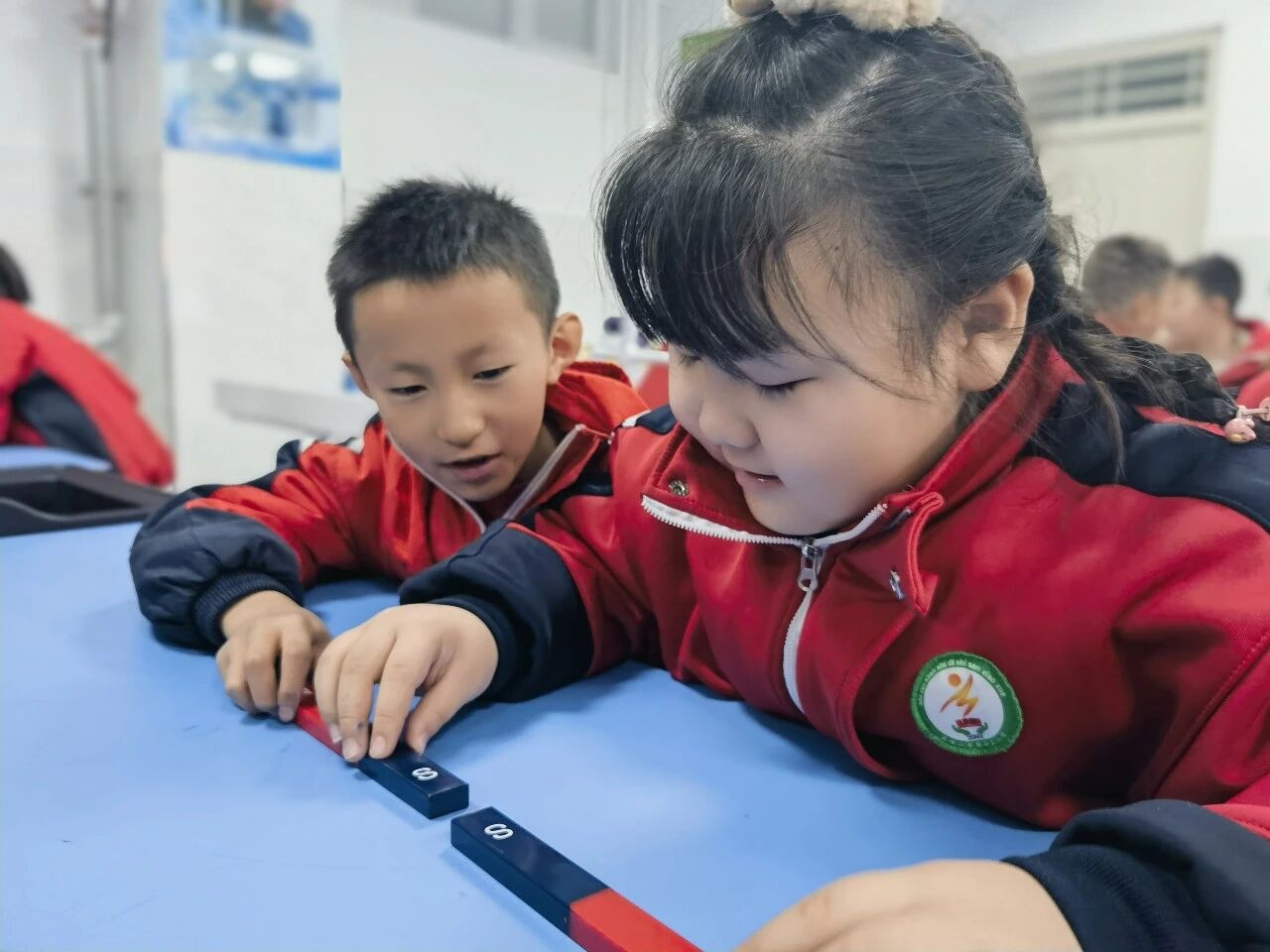 在老师指导下,石嘴山市第十三小学学生正在进行科学实验。