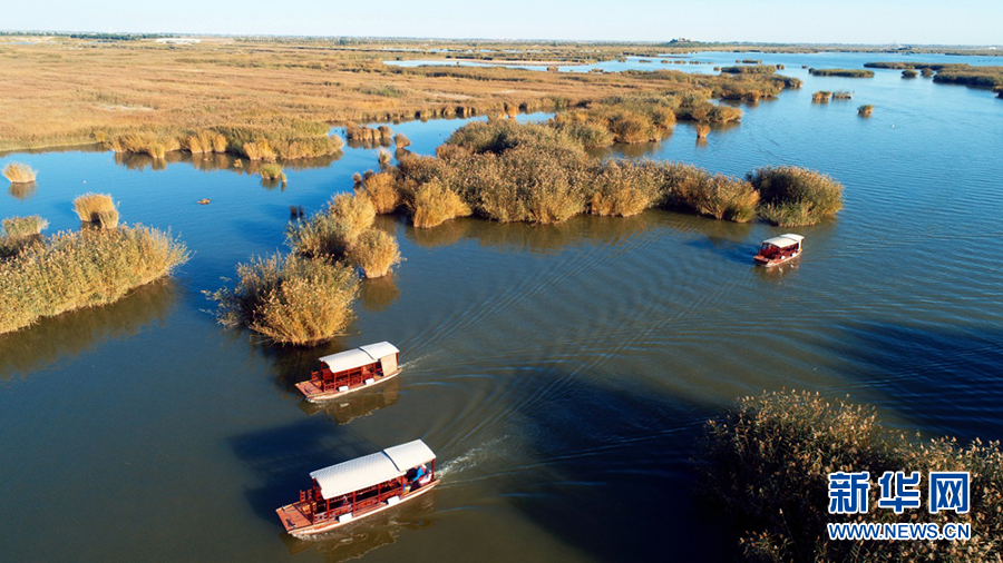沙湖:秋色融碧水,画舟荡金苇。新华网 于晶 摄