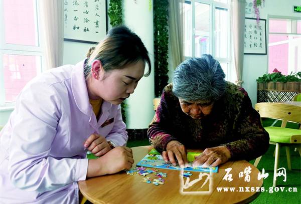 5月10日,石嘴山市社会福利院,工作人员正在带领老人进行拼图游戏。记者 徐毅 摄