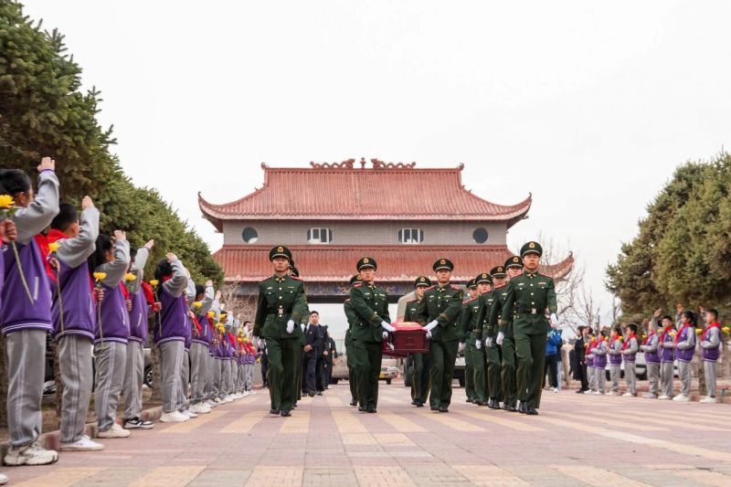 清晨,送迎仪式在潮湖村启幕。礼兵整齐列队,护送覆盖着国旗的烈士灵柩缓缓启程。沿途干部群众、学生代表手持素菊,自发列队,用最朴素的方式迎接英雄“回家”。车队抵达烈士陵园时,松柏含悲,青山静默,两位英烈终于在这片热土安息。