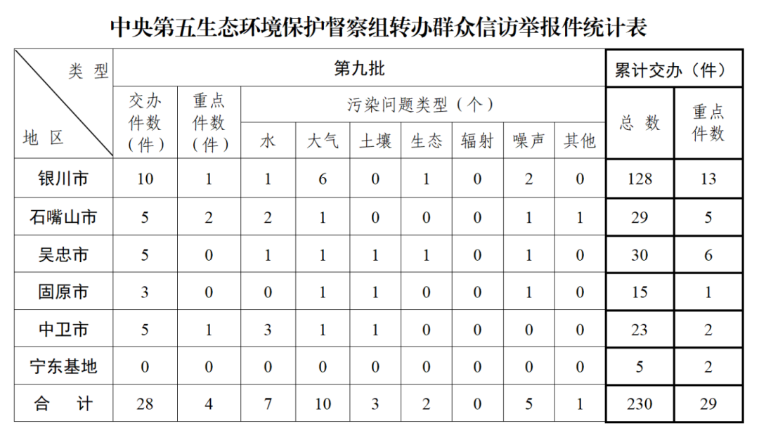 中央第五生态环境保护督察组向宁夏转办第九批群众信访举报件