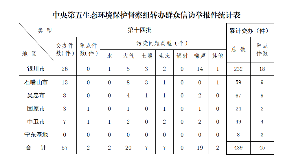 6月12日,中央第五生态环境保护督察组向宁夏回族自治区转办第十四批信访举报件共57件(重点关注件2件),其中来电49件、来信8件。本批次信访举报件涉及银川市26件、石嘴山市13件、吴忠市8件、固原市3件、中卫市7件。上述信访举报件已全部及时交办调查处理。
