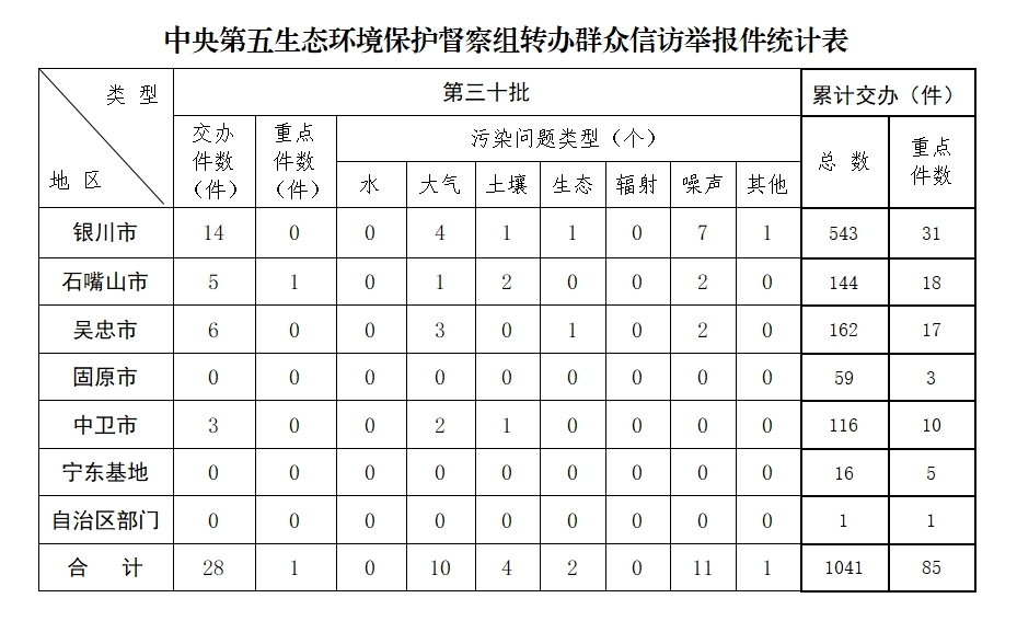 6月28日,中央第五生态环境保护督察组向宁夏回族自治区转办第三十批信访举报件共28件(重点关注件1件),其中来电26件、来信2件。本批次信访举报件涉及银川市14件、石嘴山市5件、吴忠市6件、中卫市3件。上述信访举报件已全部及时交办调查处理。