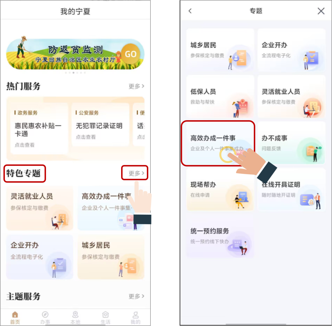 打开“我的宁夏”App首页下拉选择“特色专题”,点击“更多”,进入专题栏目,点击“高效办成一件事”。
