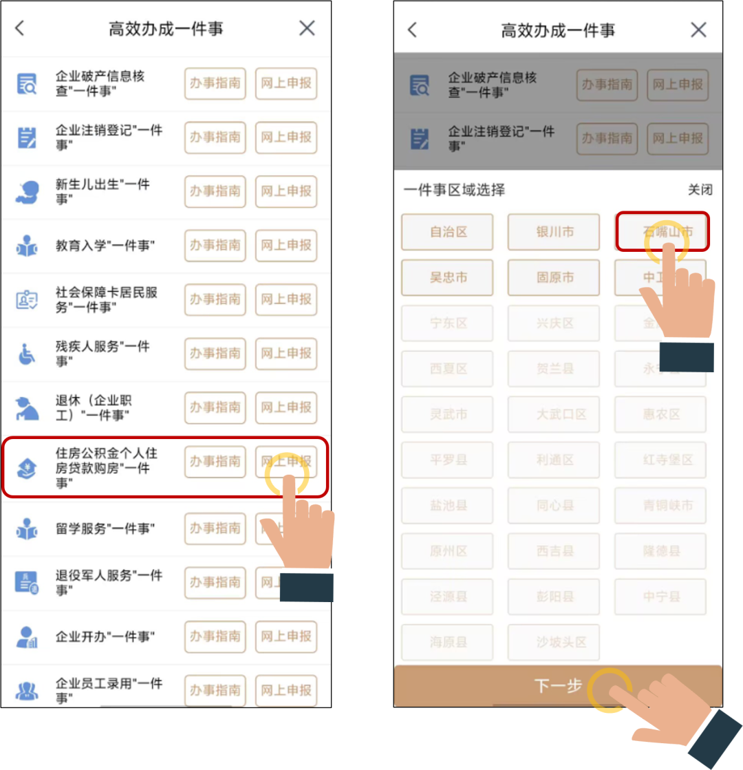 下拉选择住房公积金个人住房贷款“一件事”,点击“网上申报”,选择缴存中心,点击“下一步”。