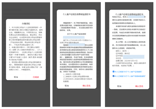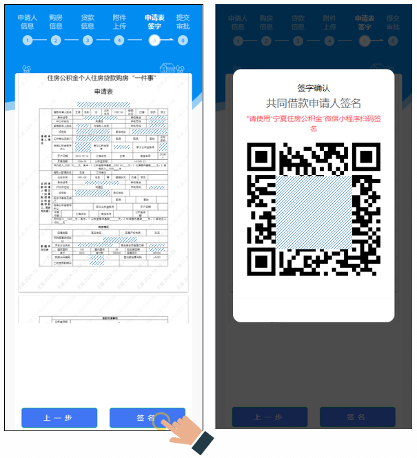确认申请表信息无误点击“签名”按钮,借款人默认签字,共同借款人需使用“宁夏住房公积金”微信小程序扫码签名(身份认证成功自动完成签字)。