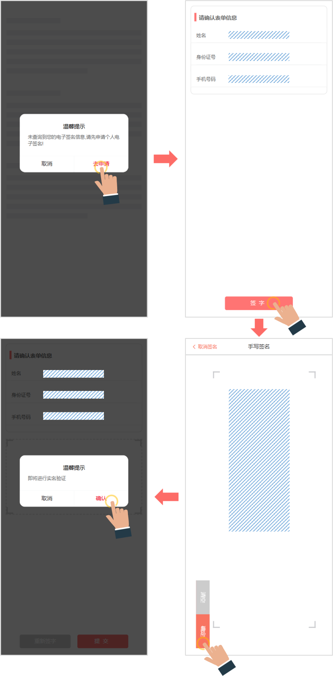 若您未申请个人签名,系统会自动检测出并提示“未查询到您的电子签名信息,请先申请个人电子签名!”点击“去申请”,在确认表单信息页面点击“签字”跳转至手写签名页面进行手绘,确定后点击“提交”,人脸识别通过后系统会自动跳转至步骤3“阅读须知”。