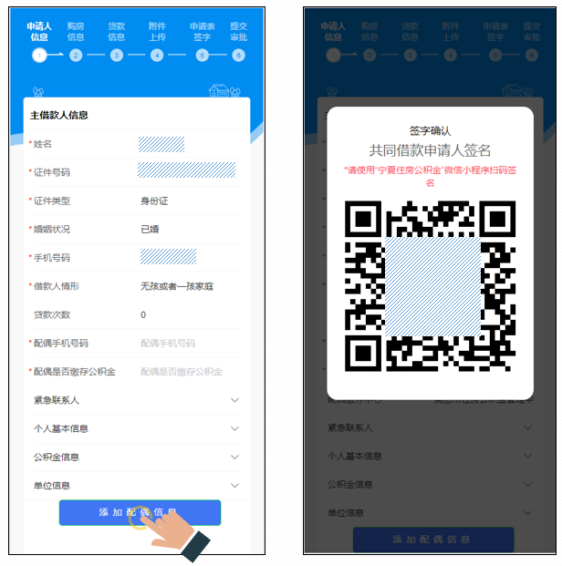 确认签名后进入申请人信息表单,核对页面信息,根据页面要求填写“主借款人信息”“紧急联系人”“个人基本信息”“公积金信息”“单位信息”;查询到未婚点击保存按钮,跳过“添加配偶信息”的步骤;查询到已婚,点击“添加配偶信息”按钮,共同借款人需使用“宁夏住房公积金”微信小程序扫码签名(身份认证成功自动完成签字)。