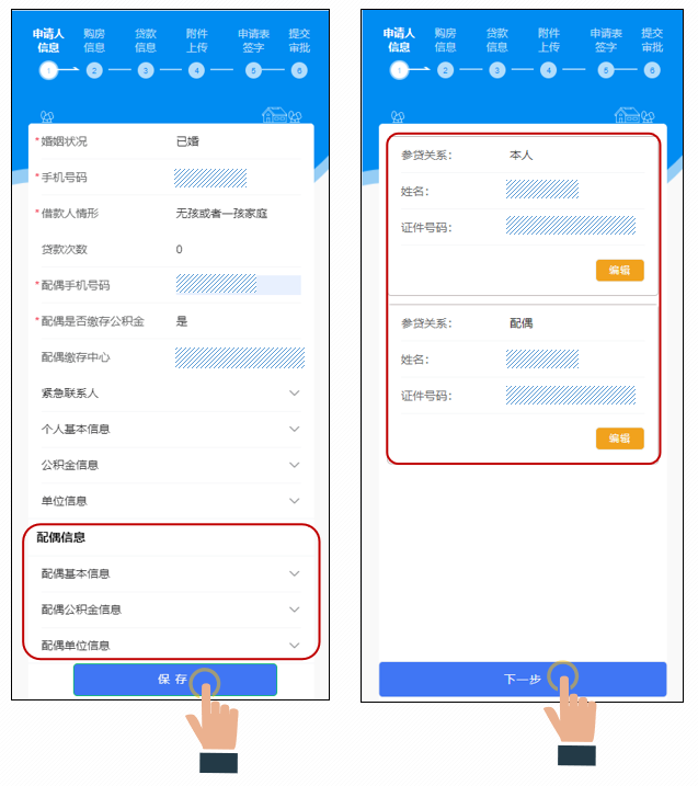 依次按要求填写“配偶基本信息”“配偶公积金信息”“配偶单位信息”,填写完成点击“保存”按钮,确认借款人信息,确认无误后点击“下一步”进入购房信息页。