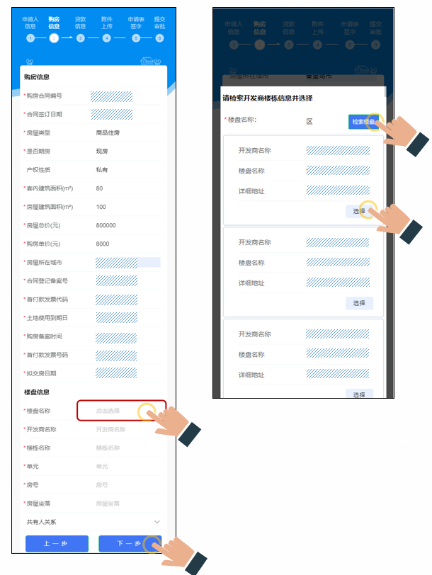 填写“购房信息”和“楼盘信息”,点击“楼盘名称”选项框,在弹出的检索框中输入楼盘名称,点击“检索楼盘”,选择要填写的楼盘点击“选择”选中楼盘信息,信息填写无误后点击“下一步”,进入贷款信息填写页。