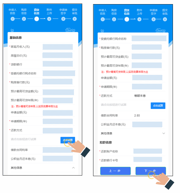 填写贷款“基础信息”和“扣款信息”,填写完基础信息点击“点击试算”按钮,系统会自动计算还款信息,信息填写并确认无误后点击“下一步”进入附件上传页。