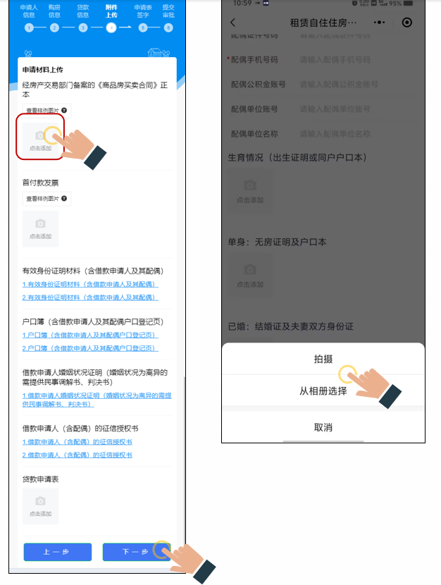 点击“点击添加”图标,选择用“拍摄”或“从相册选择”方式选择上传材料,上传完成点击“下一步”,进入申请人签字页。