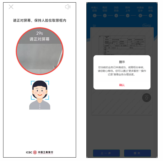 根据提示做对应动作进行人脸识别认证,认证成功后自动提交业务到柜台进行审核。