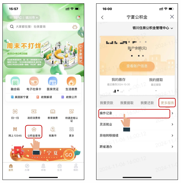业务提交成功后返回首页,点击“公积金查询”功能,点击“更多服务”--“操作记录”。
