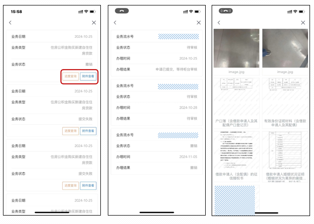 操作记录可查看申请过的业务信息,点击“进度查询”查看审核进度,点击“附件查看”,查看业务提交的材料 。