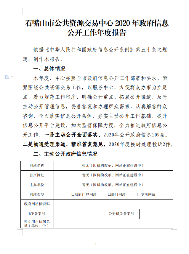 石嘴山市公共资源交易中心 2020 年政府信息公开工作年度报告
