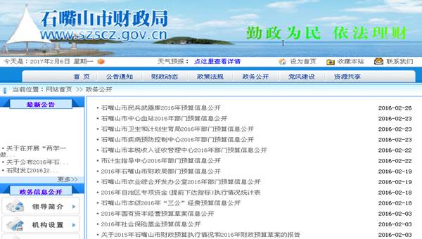 (二)加强平台建设,夯实政务公开工作基础。一是利用党政门户网站推进政务公开。以石嘴山市党政门户网站――石嘴山网为依托,在《政务公开-信息公开目录》栏目部门分类财政局专栏里,设置了组织机构、法规文件、工作动态、财政信息、人事信息等板块,方便群众及时查询相关信息。2016年通过该平台已累计发布各类信息305条。二是加强《石嘴山市财政局》门户网站建设。在《石嘴山市财政局》门户网站设立了通知公告、财政动态、政策法规、政务公开、党风建设、资源共享等栏目,主动将相关信息在网上“晾晒”,方便群众获取信息,接受群众监督。2016年通过该门户网站共发布各类信息179条。三是开通腾讯微博。通过腾讯微博有针对性地及时发布政务信息,方便干部及群众及时了解财政最新动态。2016年已累计发布各类信息215条。四是设置政务公开栏。在机关办公楼内建立了政务公开电子信息屏、政务公开栏,将局领导和科室负责人照片和联系方式进行公示,及时对重点工作完成情况等主动公开的政务信息进行滚动播放,得到了干部群众好评。