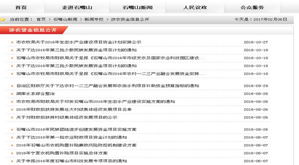 (二)涉农资金信息公开情况。2016年6月初协调新闻传媒集团在市政府门户网站-石嘴山网开设了“涉农资金”信息板块,试点开展了涉农资金信息公开工作。2016年在涉农资金信息公开板块共公示了5期涉农资金信息,公开涉农资金17341万元。