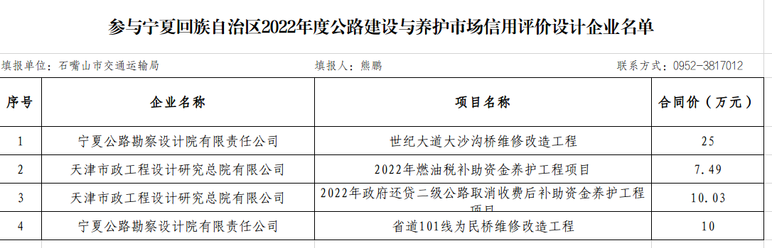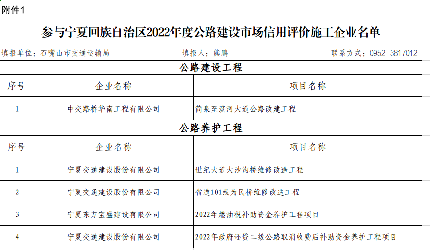 参与宁夏回族自治区2022年度公路建设市场信用评价从业企业汇总表