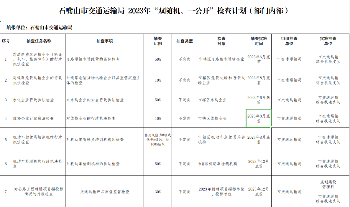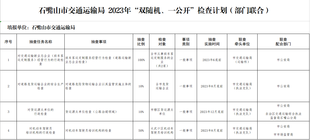 石嘴山市交通运输局 2023年“双随机、一公开”检查计划
