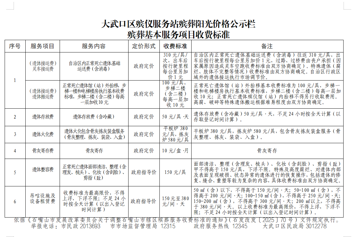 大武口区殡仪服务站殡葬阳光价格公示栏殡葬基本服务项目收费标准