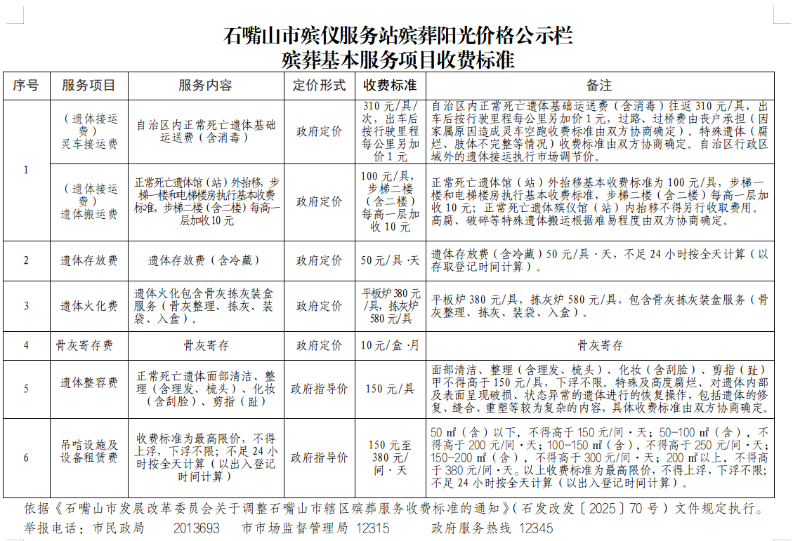 石嘴山市殡仪服务站殡葬阳光价格公示栏殡葬基本服务项目收费标准