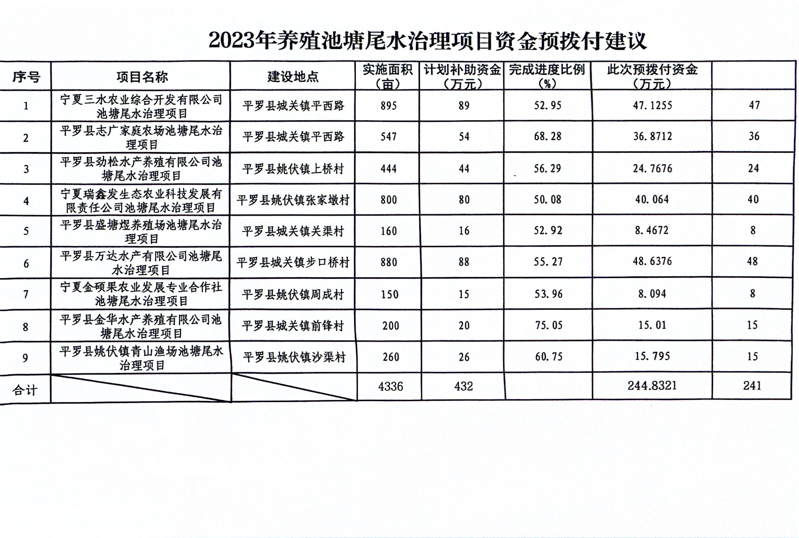 按照《石嘴山市2023年生态水产业建设项目实施方案》的要求,由各水产经营主体申报,县(区)农业农村局审核推荐上报,市农业农村局畜牧科、畜牧中心组织审核确认,经局党组会议研究决定,对稻渔综合种养项目、宁夏三水农业综合开发有限公司池塘尾水治理等项目进行补助资金预拨付,共计349.75万元。现将项目名单(详见附件)予以公示。公示时间为:2023年5月15日至5月23日。