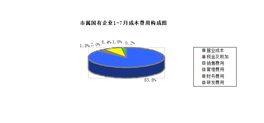(三)成本费用情况。1-7月份,15户市国资委监管企业累计成本费用总额132,755万元,同比增加17,507万元、增长15%。从构成来看,营业成本113,900万元,同比增加16,241万元、增长16.6%;税金及附加2,361万元,同比增加4万元;销售费用2,593万元,同比增加190万元、增加8%;管理费用11,199万元,同比增加486万元、增长4.5%;财务费用2,442万元,同比增加482万元、增长24%;研发费用260万元,同比增加104万元、增长67%。研发投入强度0.21%,同比增长0.04个百分点。全员劳动生产率11万元/人,同比增加0.3万元/人。