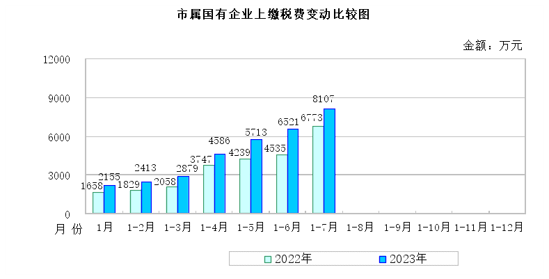 (四)税费上缴情况。1-7月份,15户市国资委监管企业累计上缴税费8,107万元,同比增加1,334万元、增长20%,主要是星瀚集团企业所得税及增值税同比增加。星瀚集团、矿业集团、九柱集团、善道集团4户企业累计上缴税费7,701万元,占市国资委监管企业上缴税费总额的95%。