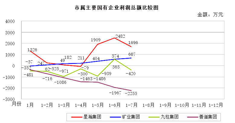 (二)效益情况。1-7月份,15户市国资委监管企业累计实现利润237万元,同比减利1,340万元,减利的主要原因是星瀚集团供热公司经营成本增加同比减利35%。15户企业中盈利企业4户,较上月减少2户,累计盈利3,315万元;亏损企业9户,较上月增加2户,累计亏损3,078万元,其中善道集团累计亏损2,255万元,占亏损企业总额的73%。主要是善道集团渡运及公交客运收入同比减少。