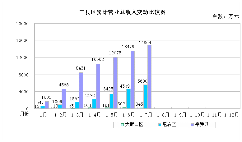 1-7月份,县(区)26户国有企业累计实现营业总收入20,809万元,同比减少2,458万元、同比下降11%。其中:大武口区累计实现营业总收入345万元,同比增加13万元、增长4%;惠农区累计实现营业总收入5,600万元,同比增加569万元、增长11%;平罗县累计实现营业总收入14,864万元,同比减少3,040万元、下降17%。