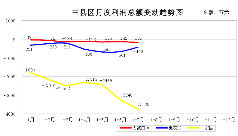 1-7月份,县(区)26户国有企业盈亏相抵累计亏损4,357万元,同比增亏1,683万元、增亏63%。其中:大武口区盈亏相抵累计亏损181万元,同比减亏10万元、减亏5%;惠农区盈亏相抵累计亏损440万元,同比减利增亏618万元;平罗县盈亏相抵累计亏损3,736万元,同比增亏1,075万元、增亏40%。