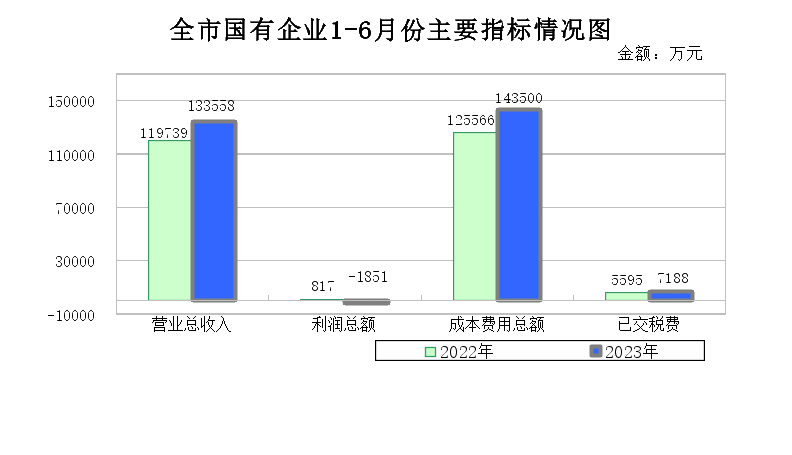 1-6月份,全市国有企业经济总体运行平稳,营业总收入稳中有增,经营利润整体有所下滑。6月末,全市41户一级国有企业累计实现营业总收入133,558万元,同比增长12%;盈亏相抵累计亏损1,851万元,同比增亏3.27倍;成本费用总额143,500万元,同比增长14%;已交税费7,188万元,同比增长28%;截至6月末,资产总额1,472,941万元,同比增长3,217万元;净资产548,073万元,同比增长5,593万元;研发经费投入强度0.17%,同比增长0.03个百分点;净资产收益率-0.6%,同比下降0.5个百分点;资产负债率63%,同比持平。