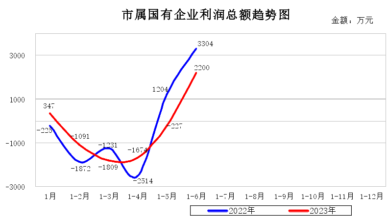 (二)效益情况。6月末,15户市国资委监管企业累计实现利润2,200万元,同比减利1,104万元,减利的主要原因是星瀚集团供热公司热源价格上涨及供热站电费增加同比减利30%。15户企业中盈利企业6户,较上月增加2户,累计盈利4,531万元;亏损企业7户,较上月减少2户,累计亏损2,331万元,其中善道集团累计亏损1,967万元,占亏损企业总额的84%。主要是善道集团渡运及公交客运收入同比减少。