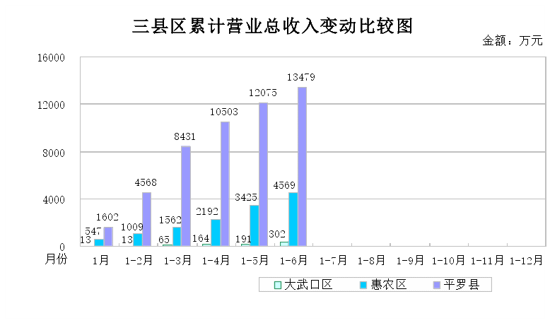 6月末,县(区)26户国有企业累计实现营业总收入18,350万元,同比减少2,418万元、同比下降12%。其中:大武口区累计实现营业总收入302万元,同比增加94万元、增长45%;惠农区累计实现营业总收入4,569万元,同比减少335万元、下降7%;平罗县累计实现营业总收入13,479万元,同比减少2,177万元、下降14%。
